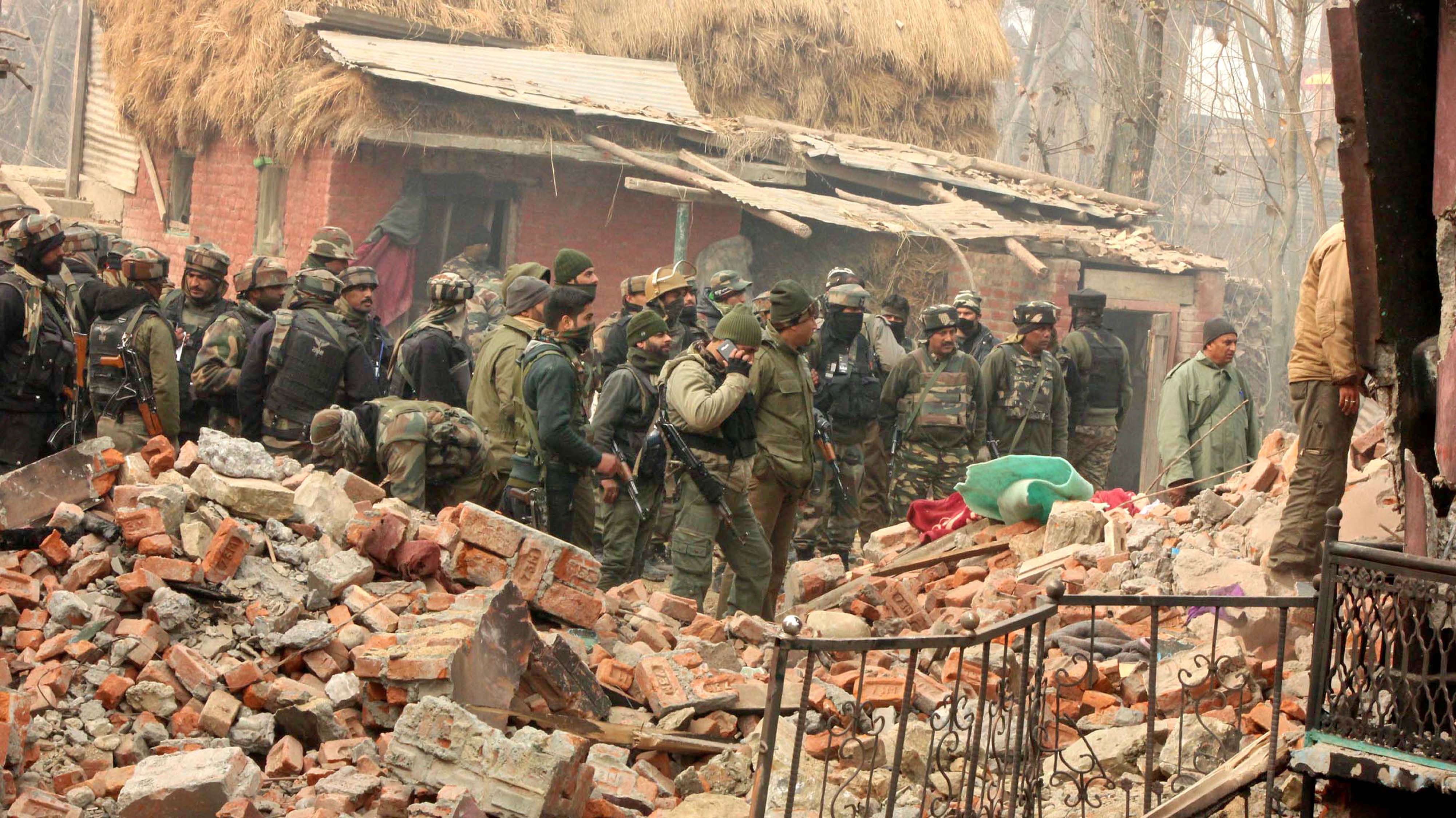 Forces stand on debris of a house razed to ground during an encounter in Arwani, Anantnag in which Lashkar commander Majid Zargar was killed