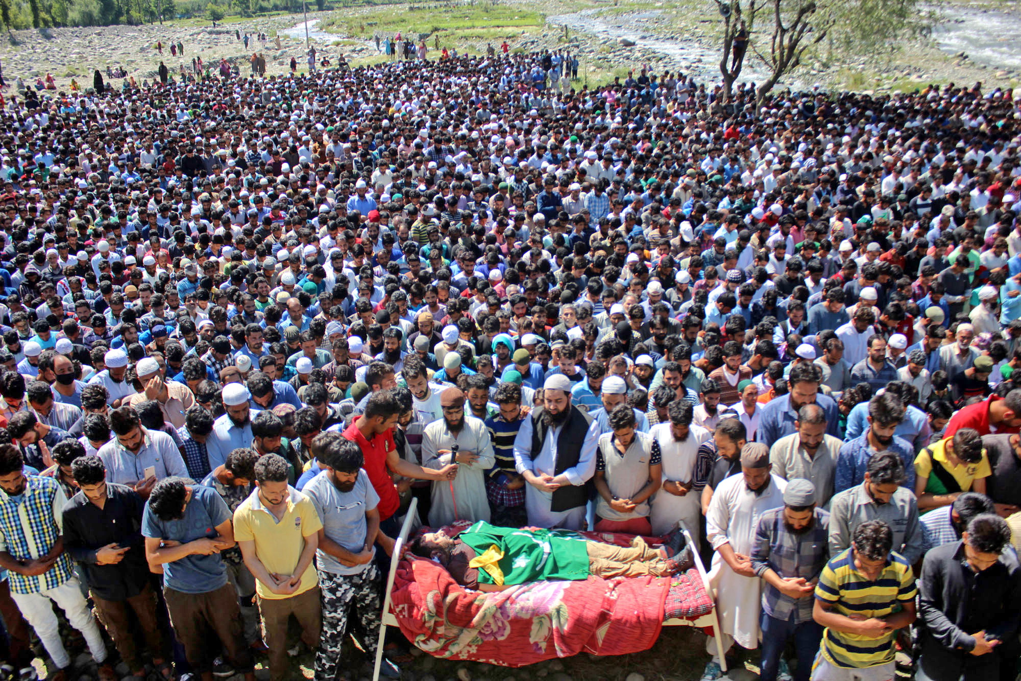 Massive public outpouring at militants’ funerals is a serious concern for the State. Above people offering funeral prayers for Lashkar commander Bashir Lashkari
