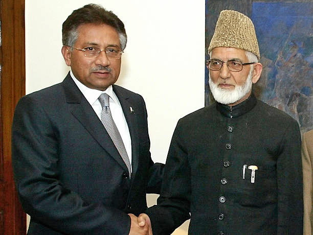 Ex-Pak President Pervez Musharraf with Hurriyat (G) chief Syed Ali Geelani in New Delhi on 17 April 2005. Geelani reportedly told Musharraf that the Indo-Pak process was ‘ignoring’ the wishes of Kashmniris