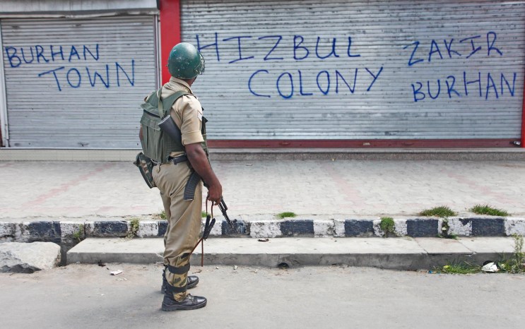 A paramilitary trooper looks at a pro-Burhan graffiti in downtown Srinagar during the 2016 agitation